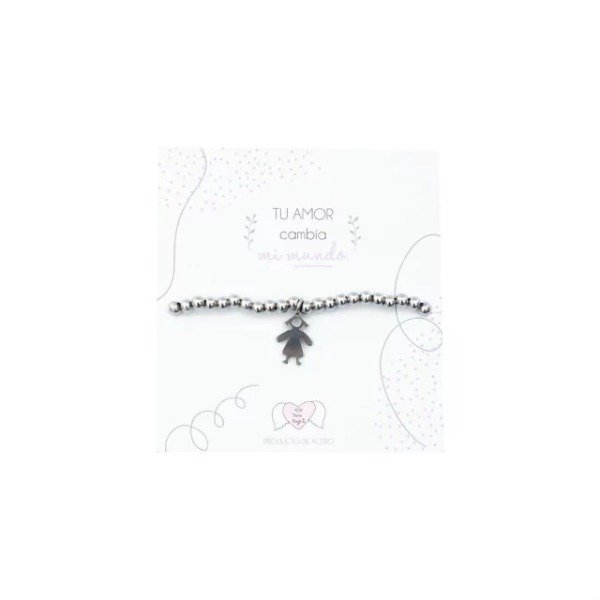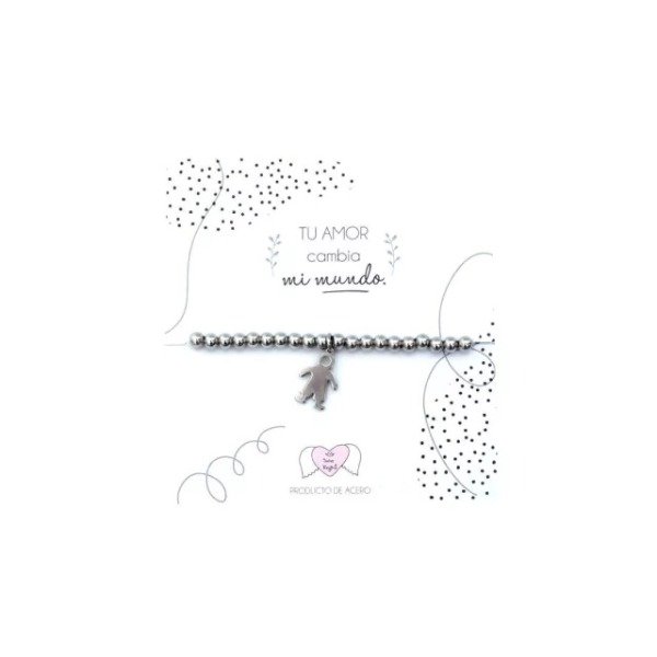 Pulsera elastizada con bolitas de acero y dije de nene o nena. Viene presentado en bolsita de gasa. Es el regalo perfecto.