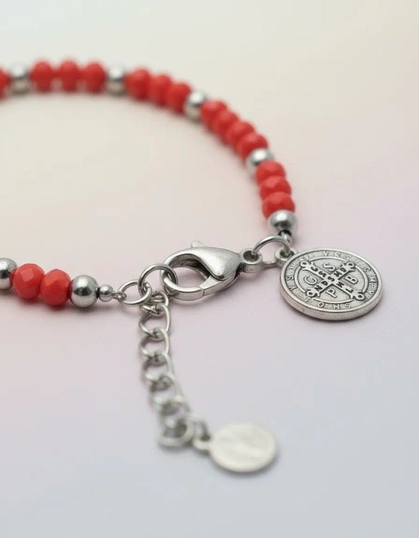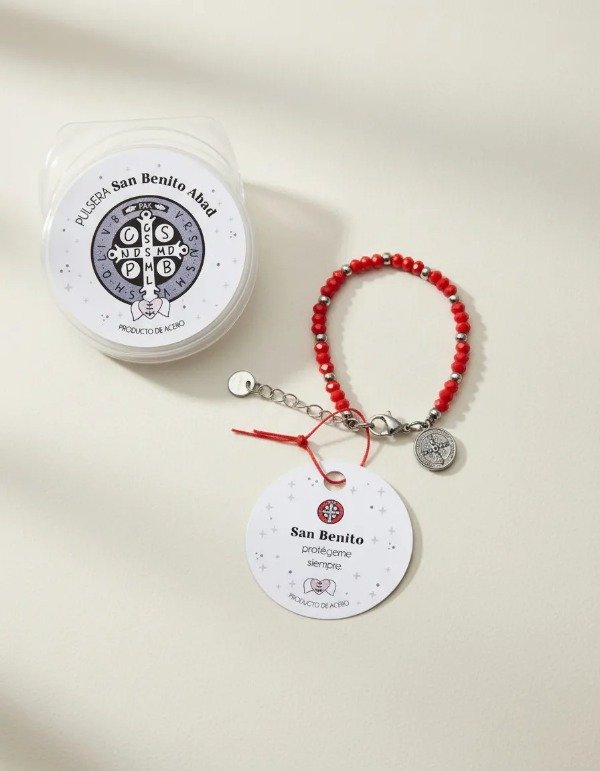 Adéntrate en la esencia de la protección con nuestra pulsera de cuentas de acero y cristal, acompañada de un dije de acero con la imagen de San Benito en un lado y la cruz en el otro.