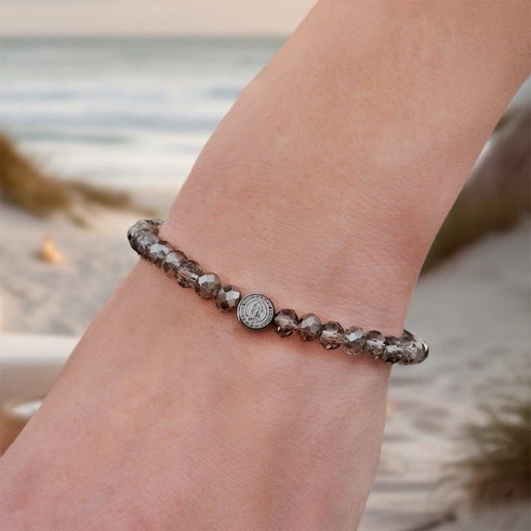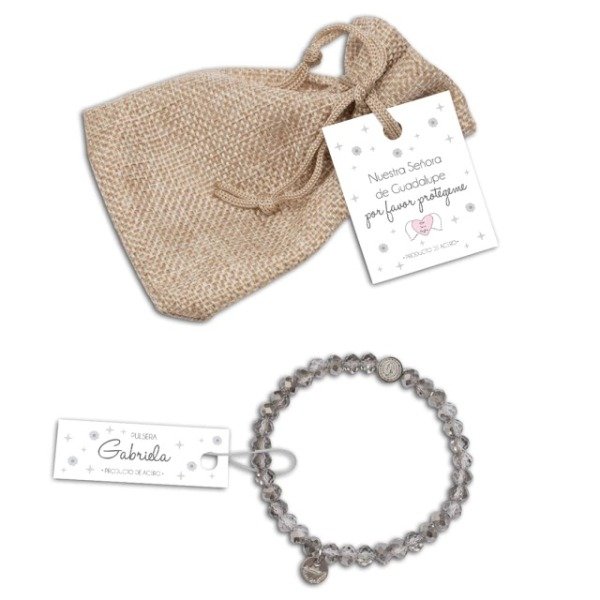 Pulsera elastizada de cristales humo con dije de Guadalupe en acero quirúrgico Un accesorio con significado, versátil y atemporal que transmite protección. Viene presentada en una bolsita de arpillera, lista para regalar.